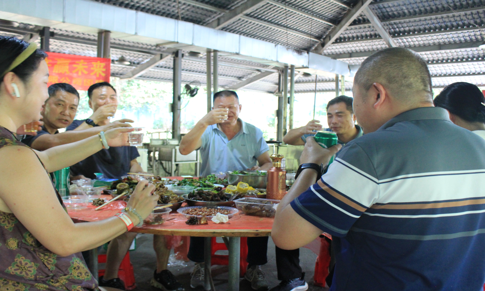 玩到中午,z期待的野炊环节开始了。生态园为每个小组准备了齐全的食材:活杀的走地鸡、刚从水库捞的鲜鱼、肥瘦相间的猪肉,还有茄子、青菜、土豆等十几种时令蔬菜,连油盐酱醋、锅碗瓢盆都一应俱全。大家自发分工:力气大的男生负责劈柴生火,火苗“噼啪”作响,很快就把土灶烧得旺旺的;女生们围着洗菜池,麻利地摘菜、洗菜、切肉;厨艺好的同事当起“主厨”,系上围裙掂起锅铲,热油下锅,先炒个香辣鸡丁,再焖个红烧鱼,香味顺着风飘满整个园区。不一会儿,每桌都摆满了菜:金黄的煎蛋、翠绿的时蔬、喷香的炖肉,虽然卖相不算精致,但每一口都是亲手劳作的滋味,大家吃得格外香,边吃边聊,气氛热闹又温馨。